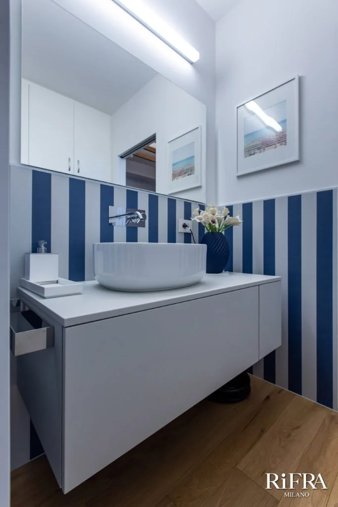 Das Gästebad wurde aufgrund des kleinen Raumes mit der weiß lackierten Kollektion KLINE ausgestattet. Eine sehr einfache und lineare Linie, die gewählt wurde, um die Nutzung des Servicebads zu unterstützen.