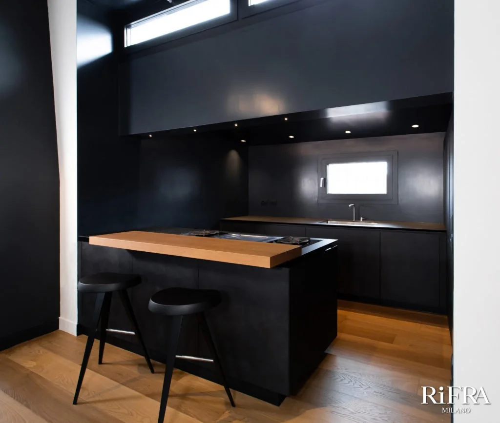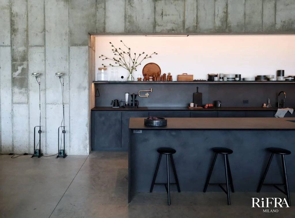 In dieser Villa hat RiFRA die Küche mit der Insel ONE aus schwarzem Zement ausgestattet. Die Wandküche mit einer Breite von 8 Metern ist Teil der Kollektion FLY, ebenfalls mit einer handgespachtelten Oberfläche aus schwarzem Zement. Beide Lösungen verfügen über schwarze Keramikplatten mit integrierten Spülbecken aus demselben Material.