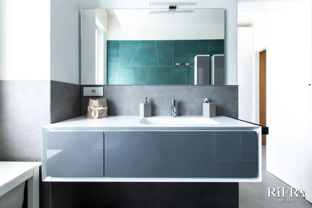 Das zweite Bad, das ebenfalls mit der Kollektion K.ONE ausgestattet ist, ist in Hochglanzlack ausgeführt. Der Schrankkörper ist reinweiß und die Vorderseite ist in Hochglanzlack Cenere lackiert.