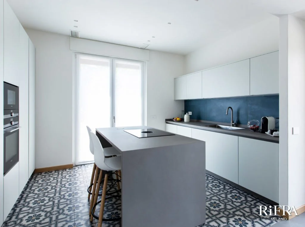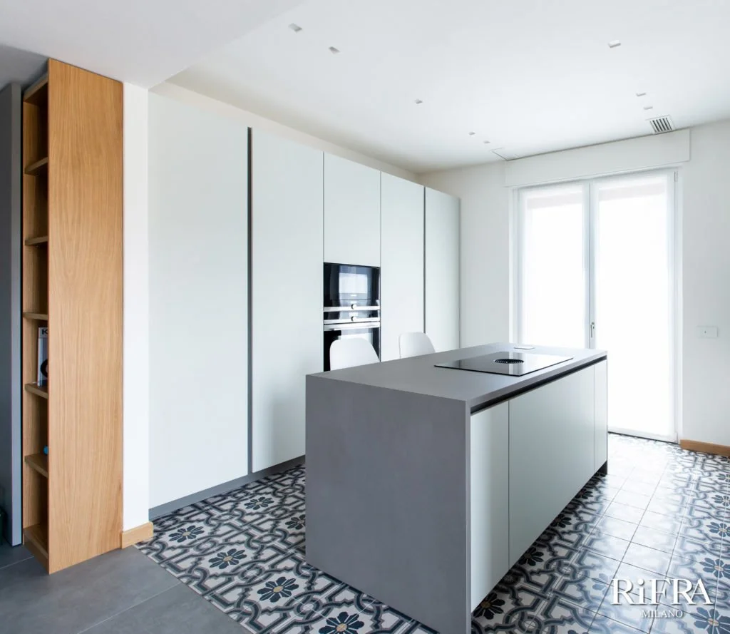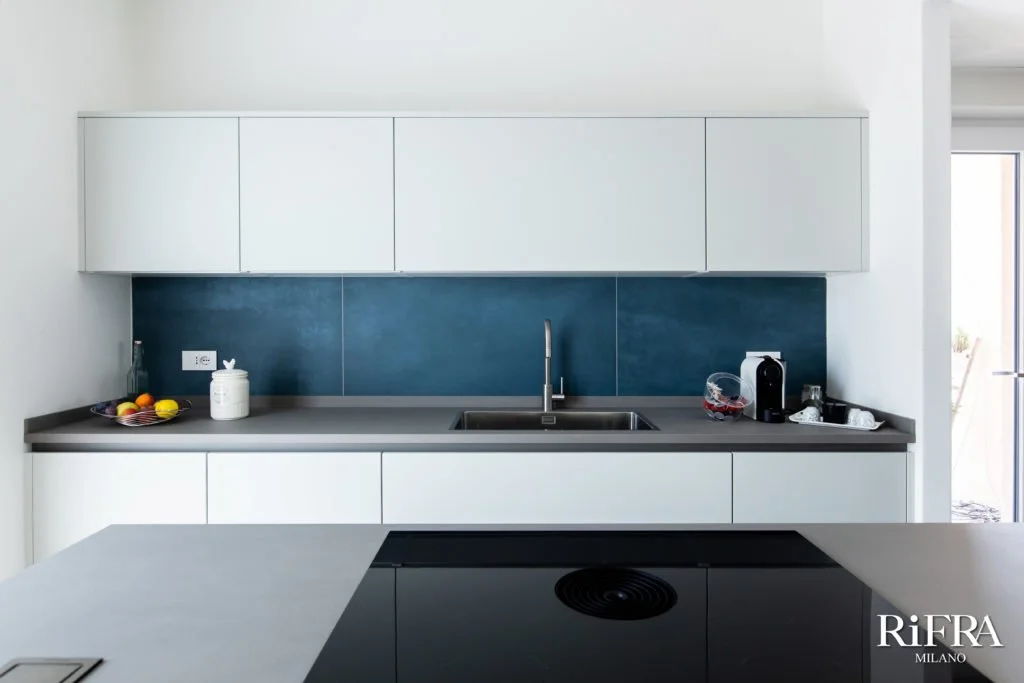 Die Küche wurde mit einer zentralen Insel ausgestattet, die aus einem Stauraum mit großen Schubladen und einem "Snack"-Bereich mit hohen Hockern für das schnelle essen oder das morgendliche Frühstück besteht. Die Arbeitsplatte der Insel besteht aus Keramik Stein in der Farbe Calce Tortora und besitzt außerdem ein Kochfeld mit integrierter Dunstabzugshaube und eine Steckdosentür.