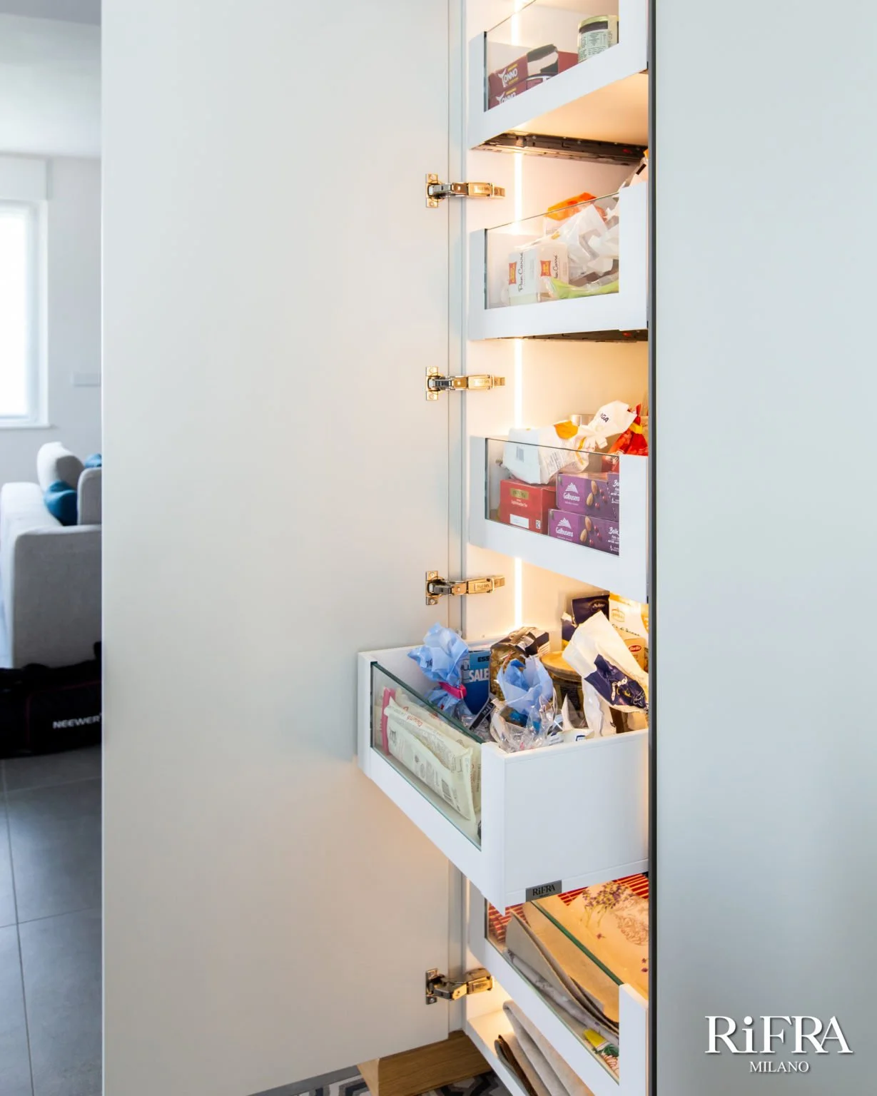 Der Speisekammerschrank wurde im Innern der Hochschränke mit ausziehbaren Glasschubladen und LED-Beleuchtung ausgestattet.