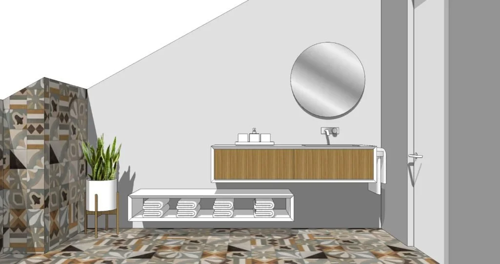Hinter diesem Bad befindet sich ein Waschraum, in dem wir Möbel nach Maß in mattweißem Lack hergestellt haben.