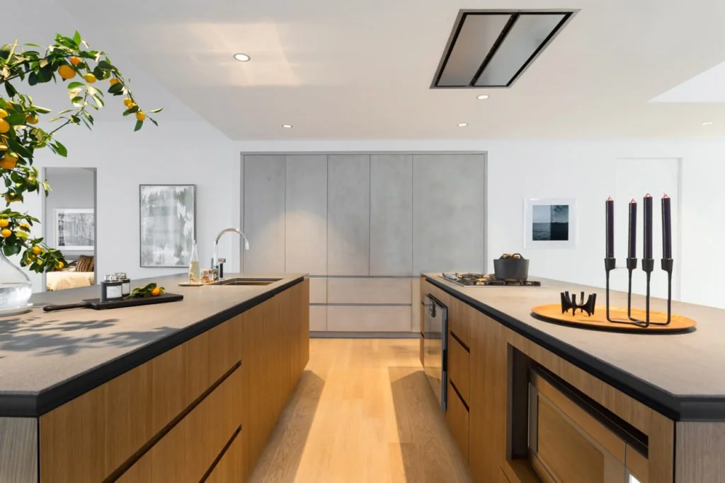 Die Doppelinselküche wird mit zwei 90 cm tiefen Inseln präsentiert; eine Insel enthält das Kochfeld und die im Schrank integrierte Dunstabzugshaube, während die zweite Insel die Spüle enthält. Beide Inseln sind dem Stauraum gewidmet; die hinteren Säulen werden sowohl als Stauraum als auch zur Unterbringung der Öfen, des Kühl- und des Gefrierschranks genutzt.