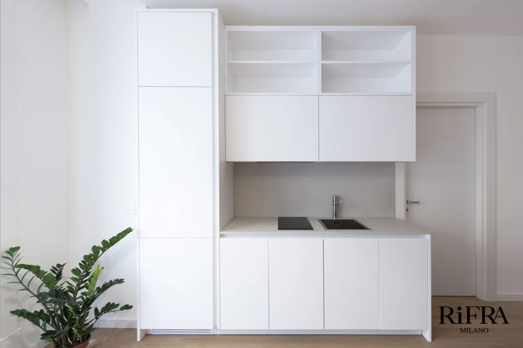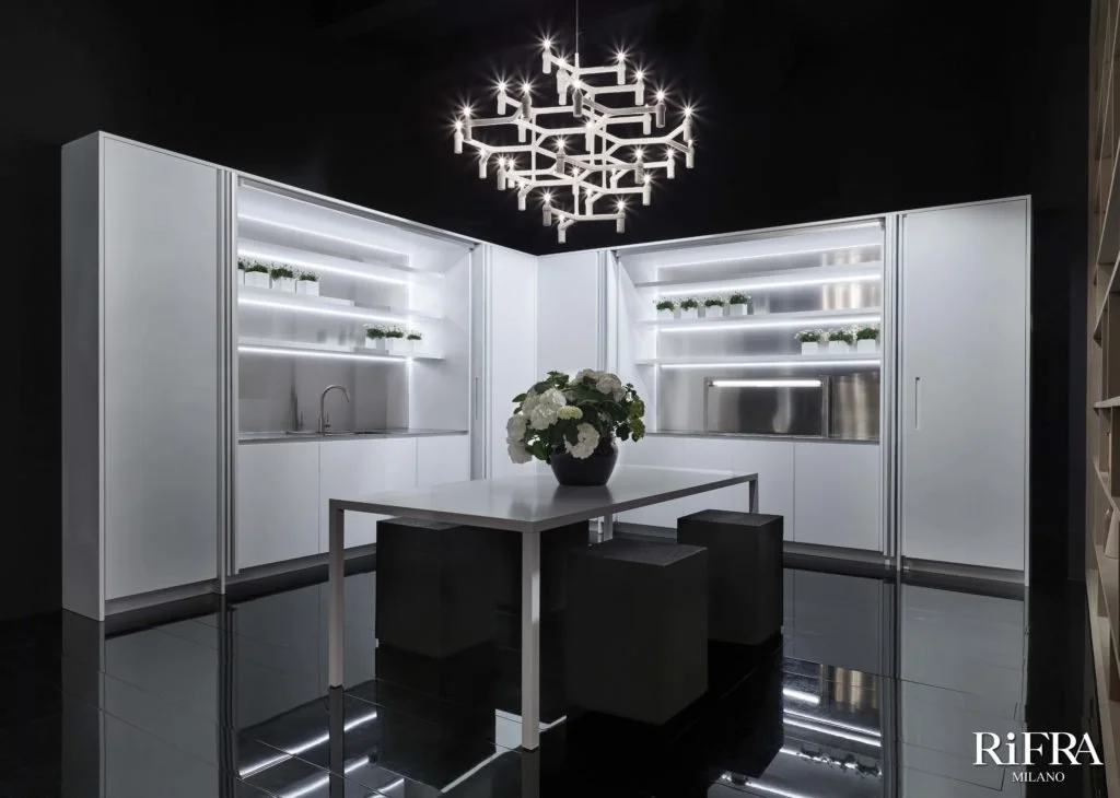 Die LINE-Küche von RiFRA hingegen verfügt über eine 90°-Bearbeitung, die keine zusätzlichen Bearbeitungen erfordert. Daher sind die Produktionskosten für diesen Küchentyp (der immer mit den gleichen hohen Qualitätsstandards wie die ONE-Küche und jedes andere RiFRA-Produkt erstellt wird) niedriger als die der ONE-Küche.