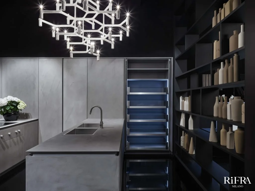 Die ONE-Küche von RiFRA verfügt beispielsweise über eine 45°-Bearbeitung um den gesamten Umfang der Küche (Top, Seiten und Sockel). Die 45°-Bearbeitung wird dann an den Küchentüren vorgeschlagen, um die stilistische Kontinuität zu gewährleisten.