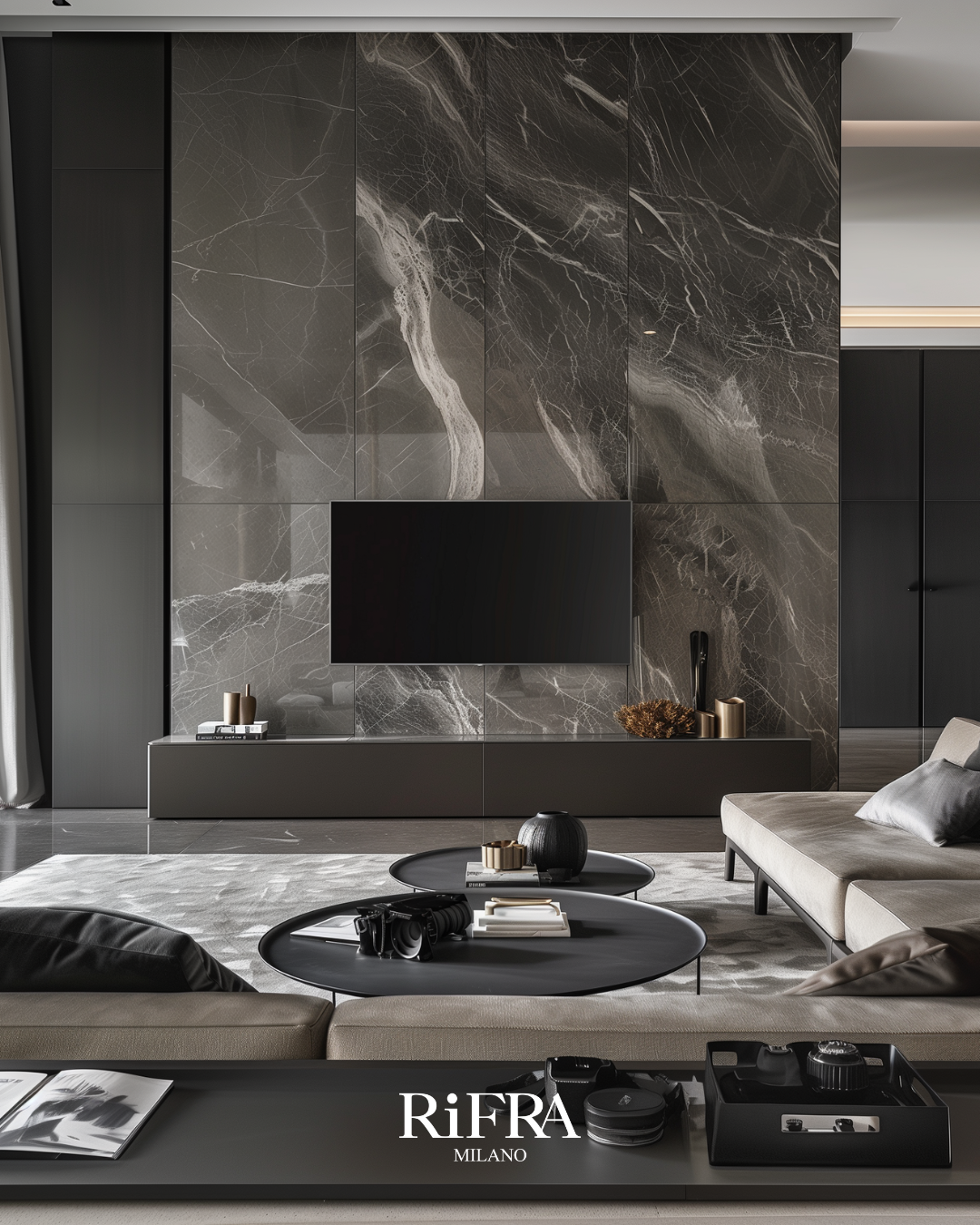 RiFRA Küchen: Elegant und avantgardistisch ist unsere Küche das Herz des modernen Hauses. Mit schwarzen Marmoroberflächen, die sich mit linearen und anspruchsvollen Schrankwänden verbinden, sind sie für diejenigen gedacht, die sich abheben und Schönheit im Alltag genießen wollen.