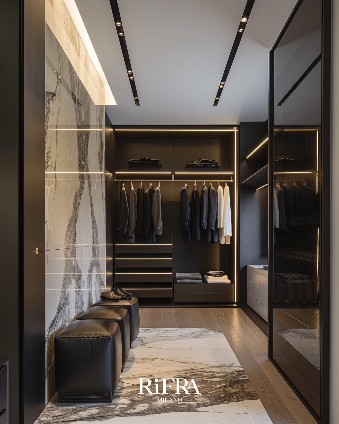 RiFRA Garderoben: Ordnung trifft auf Eleganz. Eine maßgeschneiderte Umgebung für Ihre wertvollsten Kleidungsstücke, mit Beleuchtung, die darauf ausgelegt ist, jedes Detail hervorzuheben und eine überlegene Benutzererfahrung zu bieten.